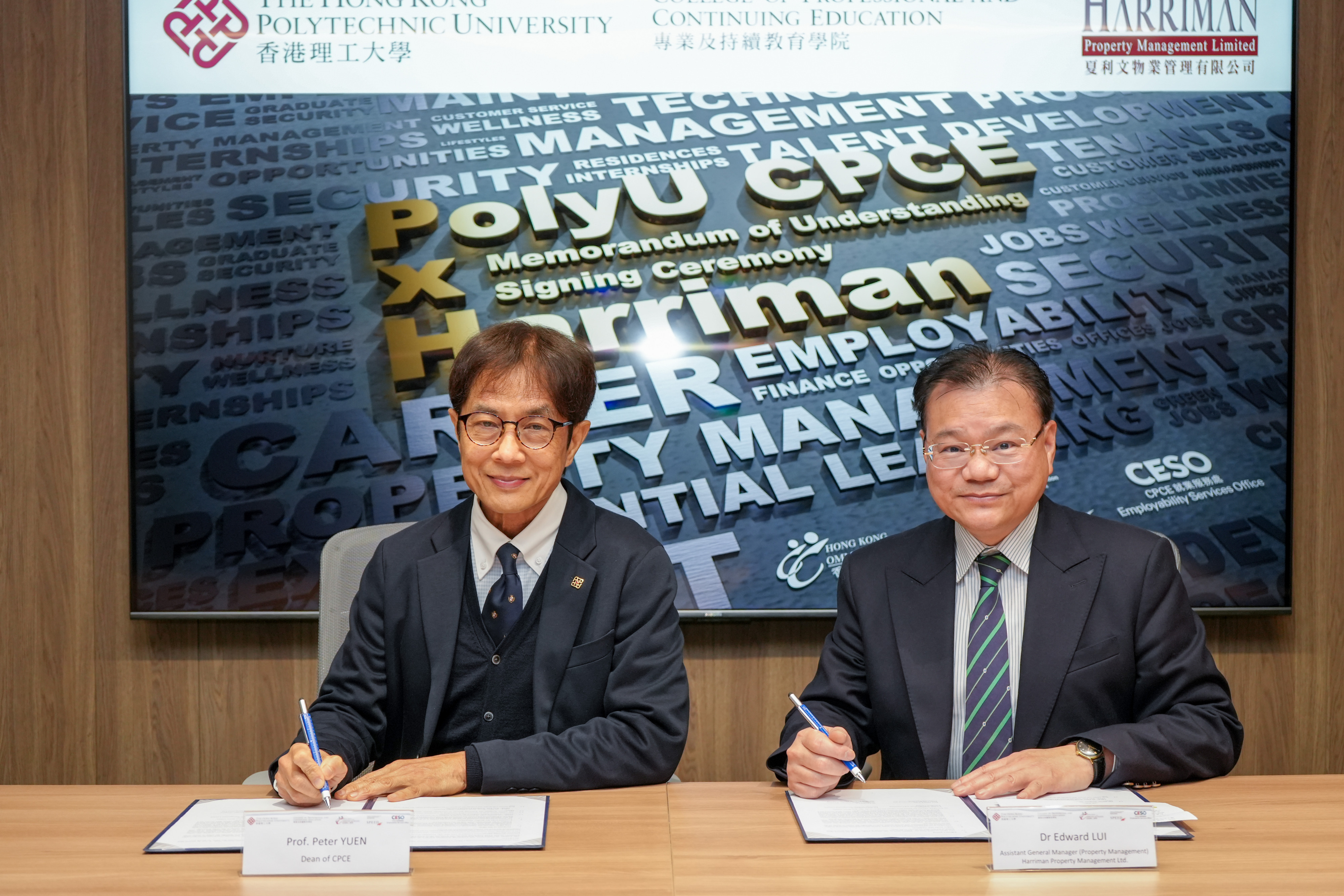 The MOU was signed by Professor Peter Yuen, Dean of PolyU CPCE, and Dr. Edward Lui, Assistant General Manager (Property Management) of Harriman. Upon completion of the placement, Harriman will give priority to hiring participating students as full-time staff, further strengthening the talent pipeline for the industry.